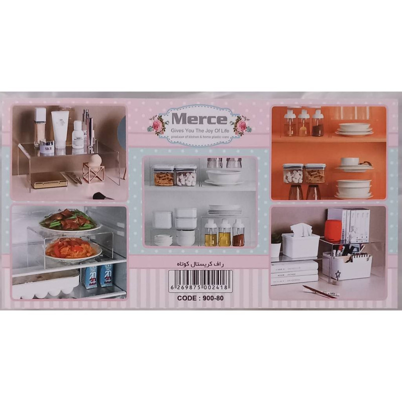 راف کریستال کوتاه مرسه، از جنس اکریلیک است. این محصول مناسب نظم دهی به طبقات کابینت، یخچال میز آرایش و … می باشد. این محصول در عین کم حجمی و سبکی دارای کاربرد فراوانیست و در نظم دهی وسایل منزل شما بهترین انتخاب است.