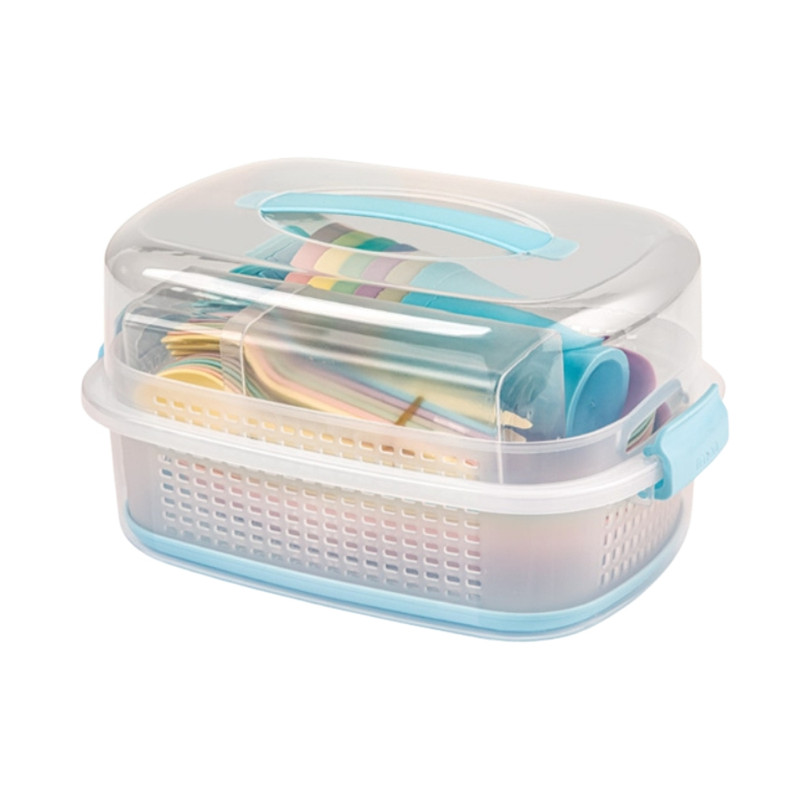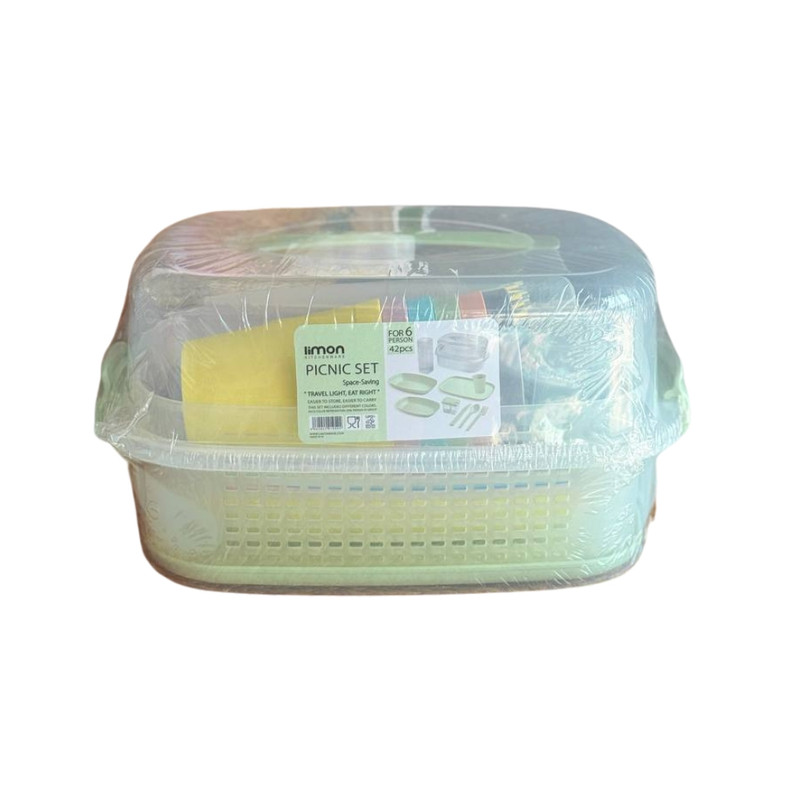 ظروف دارای 6 رنگ میباشد. هر رنگ برای یک نفر // یک ظرف نگهدارنده قاشق و چنگال، 6 عدد لیوان آبخوری، 6 عدد بشقاب کوچک مستطیلی، 6 عدد بشقاب بزرگ مستطیلی، 6 عدد قاشق غذاخوری، 6 عدد چنگال غذاخوری و 6 عدد کارد، یک سینی مستطیلی، یک عدد آبکش، یک عدد نمکپاش و فلفل پاش است.