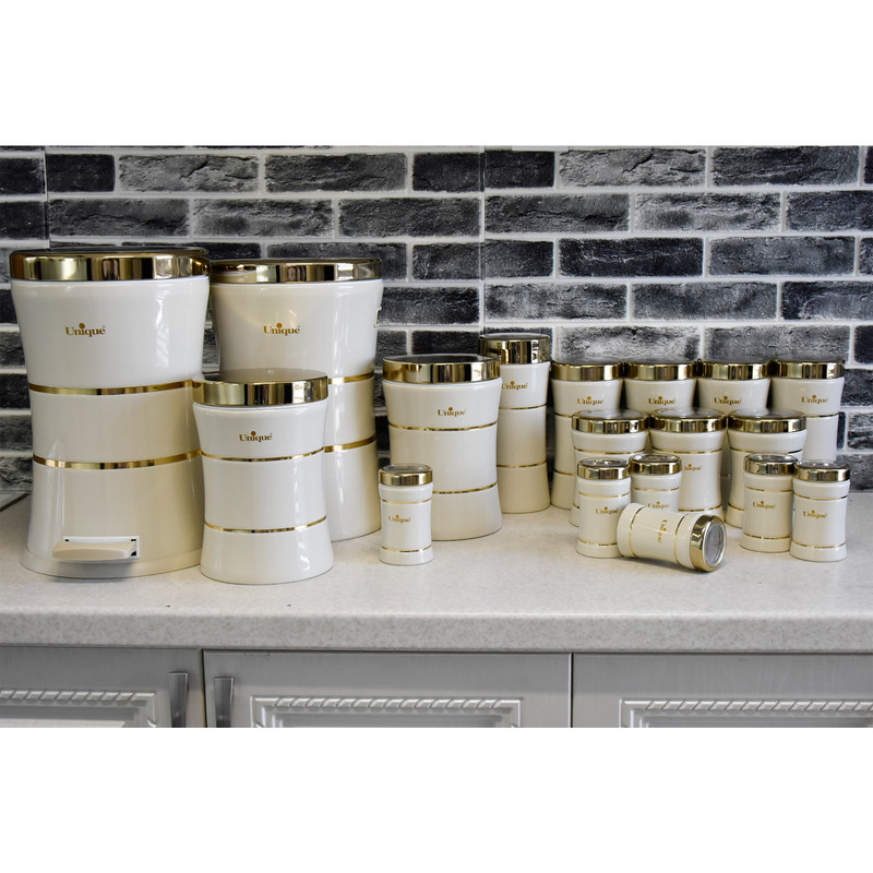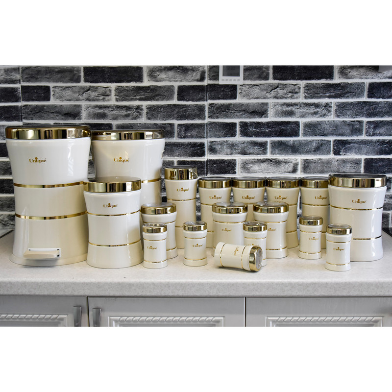 “سرویس آشپزخانه 18 پارچه شامل قوطی های بسیار با کیفیتی است که در اندازه های مختلف تولید شده اند. میتوانید از این قوطی ها برای نگهداری مواد غذایی مختلف استفاده کنید. این ست شامل :سطل برنج 1عدد سطل زباله 1عدد سطل شکر 1عدد سطل قند 1عدد بانکه اسپاگتی 1عدد بانک متوسط 3عدد بانکه بزرگ 4عدد جای ادویه 6عدد