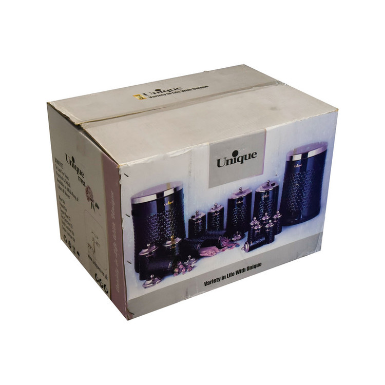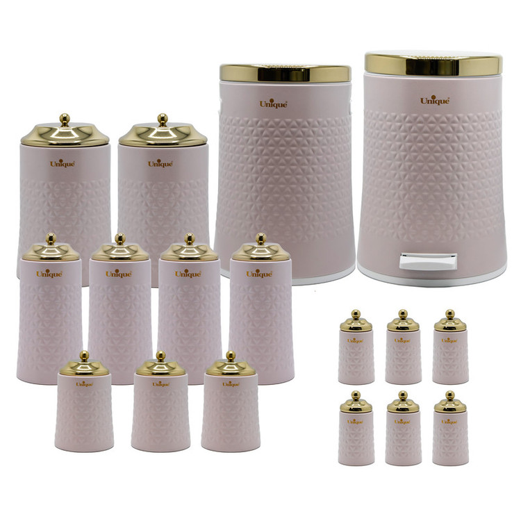 “سرویس آشپزخانه 17 پارچه گلکسی یونیک شامل قوطی های بسیار با کیفیتی است که در اندازه های مختلف تولید شده اند. میتوانید از این قوطی ها برای نگهداری مواد غذایی مختلف استفاده کنید. برای مثال حبوبات، نمک، برنج، قند و شکر، ادویه جات و … . این سرویس شامل: سطل زباله سطل برنج 2عدد سطل بزرگ قند و چایی 4 عدد سطل متوسط حبوبات 3عدد سطل کوچک 6 عدد جا ادویه کوچک