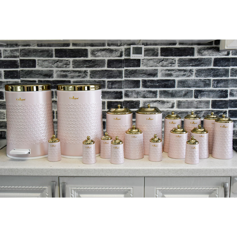“سرویس آشپزخانه 17 پارچه گلکسی یونیک شامل قوطی های بسیار با کیفیتی است که در اندازه های مختلف تولید شده اند. میتوانید از این قوطی ها برای نگهداری مواد غذایی مختلف استفاده کنید. برای مثال حبوبات، نمک، برنج، قند و شکر، ادویه جات و … . این سرویس شامل: سطل زباله سطل برنج 2عدد سطل بزرگ قند و چایی 4 عدد سطل متوسط حبوبات 3عدد سطل کوچک 6 عدد جا ادویه کوچک